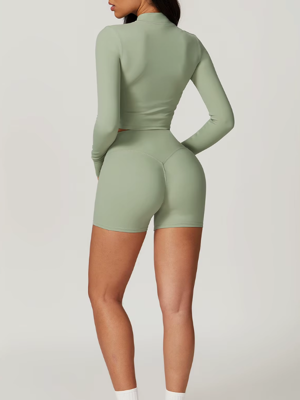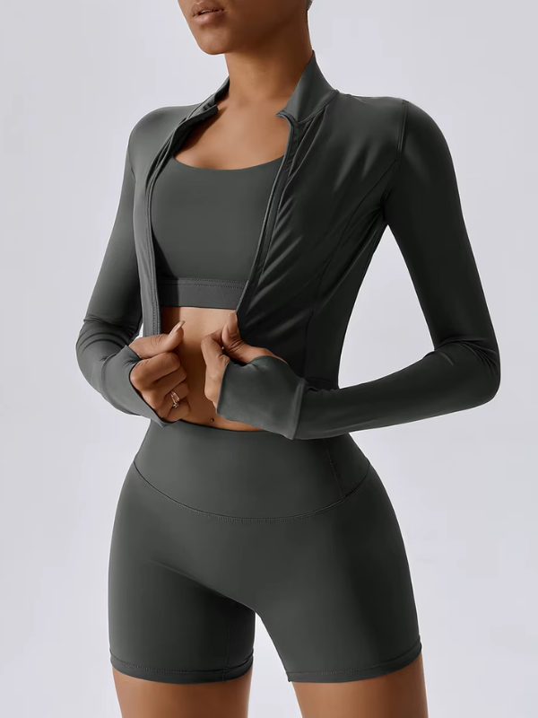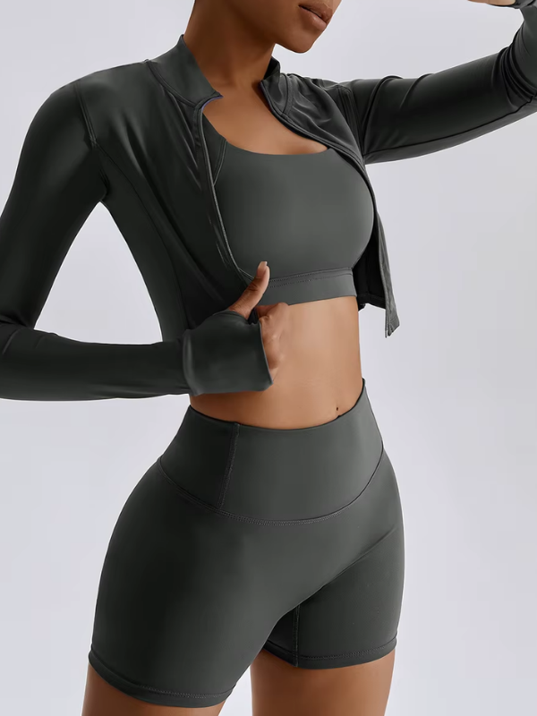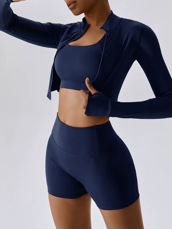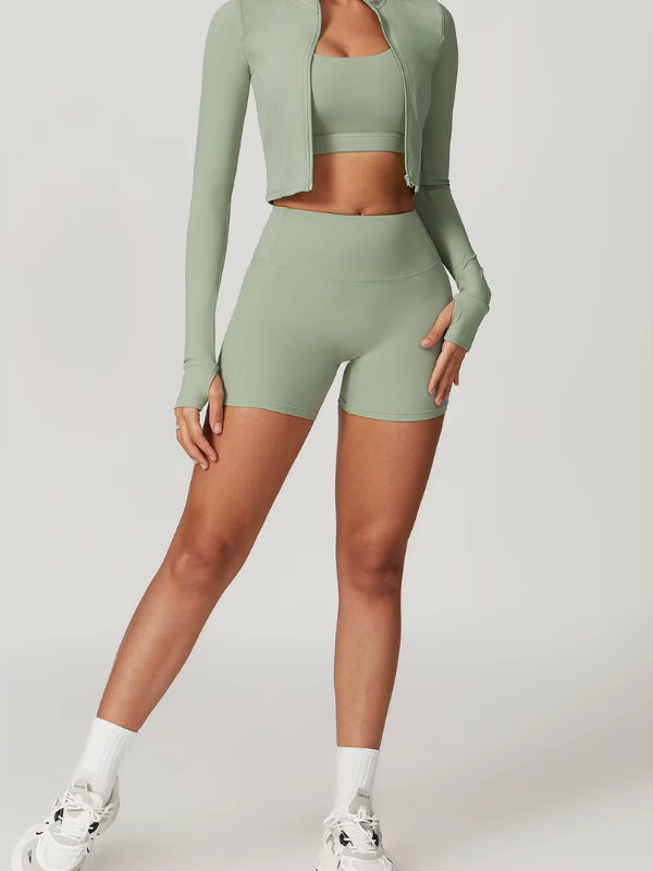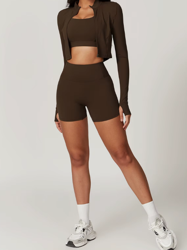 Ensemble 3 pièces composé d’une brassière, d’un short taille haute et d’une veste zippée. Alliance parfaite de maintien, confort et polyvalence, idéal pour l’entraînement comme pour un look athleisure élégant.