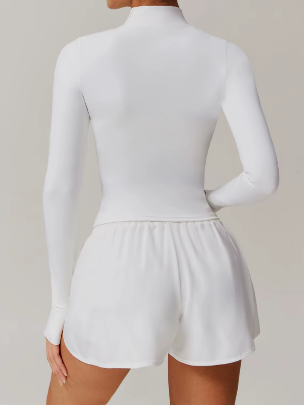 Veste ajustée à manches longues avec zip intégral et passe-pouces, conçue pour offrir respirabilité, aisance et style dans toutes tes sessions sportives.